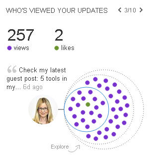 I hope my guest post on sofarbeyond’s site on my 5 top social media tools was well received. My LinkedIn contacts obviously liked it – looking at LinkedIn’s new “Who’s Viewed Your Updates” feature, I can see that it got 257 views via LinkedIn. Another great LinkedIn feature, and also proof that sharing via LinkedIn may drive more traffic than any other referral channel.